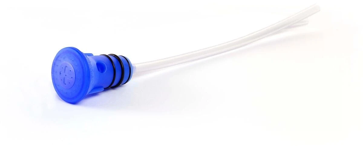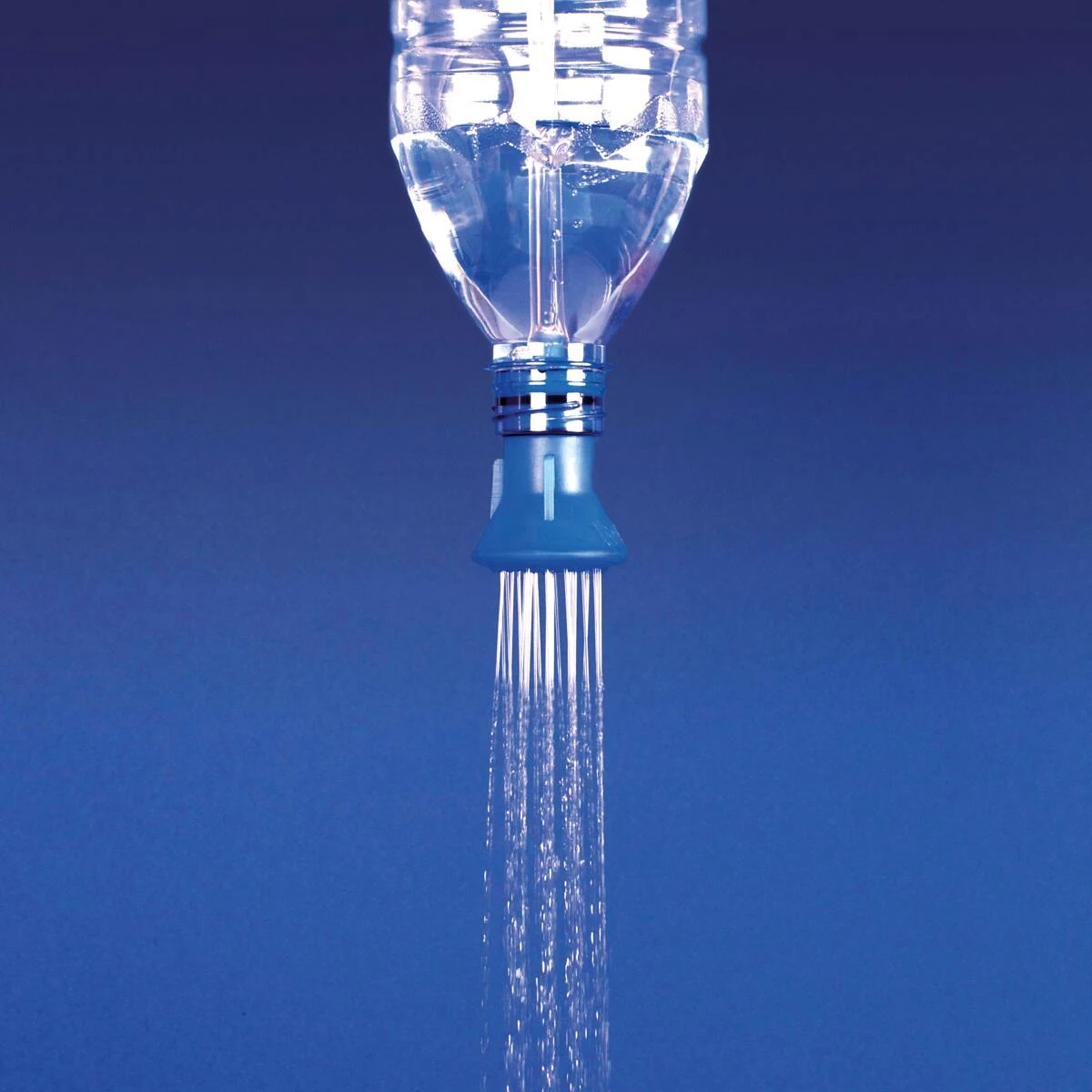 Duschkopf, der sich in die meisten Standard-Wasserflaschen einsetzen lässt. Die Fließgeschwindigkeit wird durch den Kopf herabgesetzt, sodass man mit einer 2 Liter Flasche über zwei Minuten duschen kann.