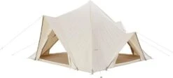 Midgard 20 m2 kann als zentrale Komponente eines gekoppelten Aufbaus mit den Vimur Firstzelten der Midgard Zeltserie oder auch als geräumiges, komfortables und individuelles Gruppenzelt eingesetzt werden. Der Aufbau eines einzelnen Zeltes ist sehr einfach, da zur Verankerung nur 16 Heringe erforderlich sind. Durch die großzügig bemessenen Fenster und die Türen aus Moskitonetz gelangt besonders viel Luft und Licht ins Zeltinnere. Das große Vordach über dem Eingang schützt vor Witterungseinflüssen und ermöglicht offene Türen- selbst bei Nieselregen. Die patentierten Turtle Hub“ Gestängeverbinder aus dem Hause Nordisk kombinieren innovative Technologie mit historisch inspirierten Designs und Funktionen.