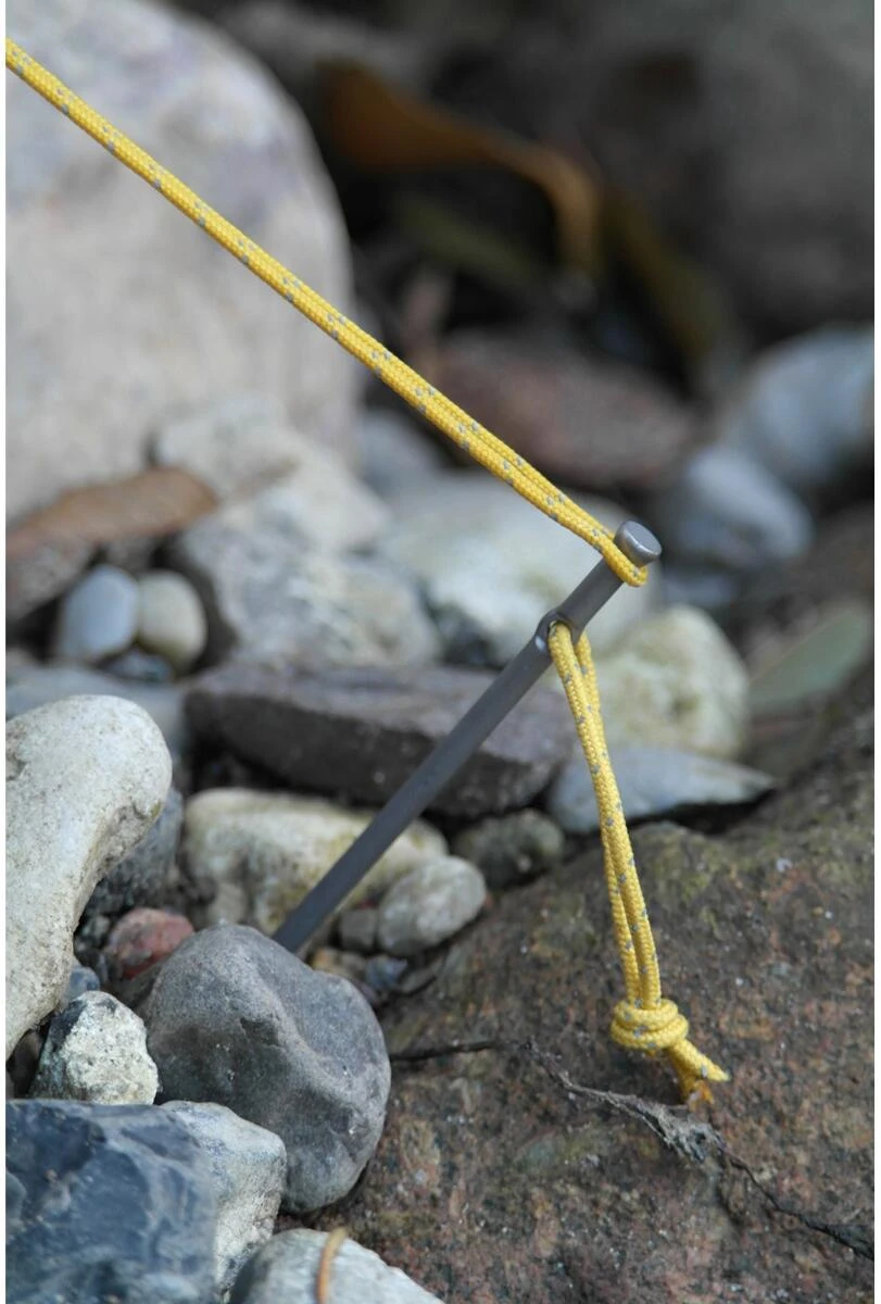 Der 8 Gramm Titannagel ist im Grunde die perfekte Mischung aus Gewicht, Festigkeit und Packmaß, was ihn zu einer hervorragenden Wahl macht, wenn das Packmaß ein entscheidender Faktor ist. Das minimalistische Design bietet einen hochfunktionalen Hering, der leicht in sowohl weiche als auch harte Böden eindringt. Die Nagelform eignet sich besonders gut für Gebiete, in denen die Möglichkeiten für normale Heringe eher begrenzt sind, wie im Gebirge mit vielen steinigen und felsigen Untergründen – oder in Gebieten mit extrem harten Böden wie beispielsweise hartem Lehm. Dank dem sehr robusten Material und der stabilen Ausführung lässt sich der Nagel einfach in den Boden hämmern und durch die Abspannleine lässt sich der Hering auch einfach wieder herausziehen.