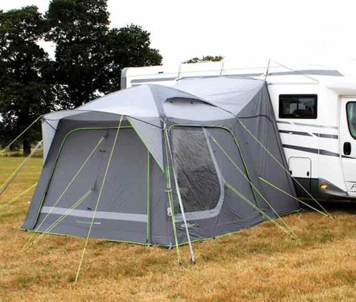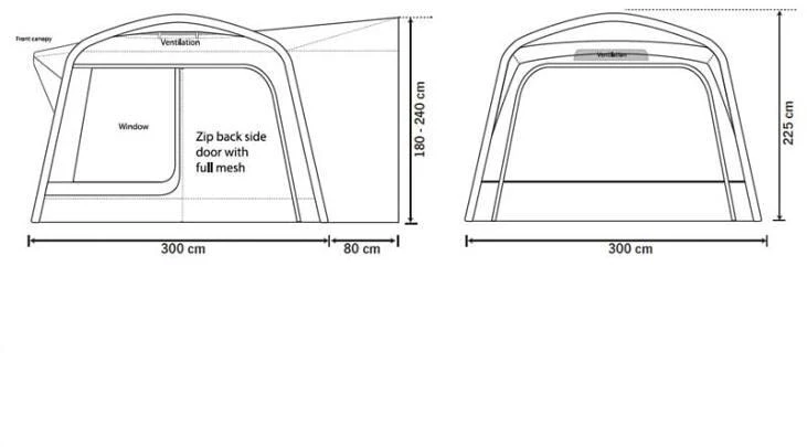 Freistehendes Busvorzelt mit kleinem Vordach über dem Eingang. Belüftungsöffnungen links und rechts im Dach, sowie zur Vorder- und Hintertür. Alle Fenster verfügen über integrierte Vorhänge, die tagsüber zurückgerollt oder für die Nacht mit Reißverschluss geschlossen werden. Die Seitentüren sind mit Netz-Fliegengittern ausgestattet, um Insekten draußen zu halten. Links und rechts sind Türen in der Schleuse.