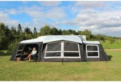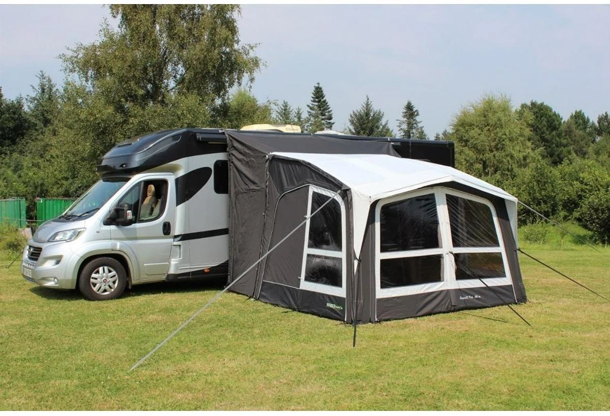 NEU für 2023 ist das Esprit Pro X 350M ein Premium-Reisemobil-Vorzelt. Die Markise wird durch eine optionale kreuzkompatible Seitenverlängerung und einen seitlichen Anbau ergänzt, dieses neue Design von Outdoor Revolution wird die Messlatte in Bezug auf luxuriöse Verandamarkisen noch einmal höher legen. Diese Baureihe basiert auf der neu entwickelten Single-Inflation-Verbindungszelle unter Verwendung der neuesten verfügbaren Technologie. Diese neue Technologie ermöglicht es, Teile der Luftzelle zu verbinden und anschließend mit Schleusenventilen zu isolieren. Dieses bahnbrechende System bietet absolute Leichtigkeit von Inflation und Deflation mit absoluter Sicherheit, da es ermöglicht, jeden Teil der Struktur von anderen Teilen der Flugzeugzelle zu isolieren. Die Serie besteht aus unserem luxuriösen Pro 600HD High Allwetter-Premium-Material für ultimative Haltbarkeit und Wetterschutz. Die brandneue Esprit Pro X Markisenserie erfüllt alle wichtigen Anforderungen an anspruchsvolle Caravaner, die einfach nur das „Best in Class“ verlangen. Das Motorhome-kompatible Modell hat eine 90cm tiefe Motorhaube, die den kompletten Abstand vom Van zur Front 350cm kombiniert.