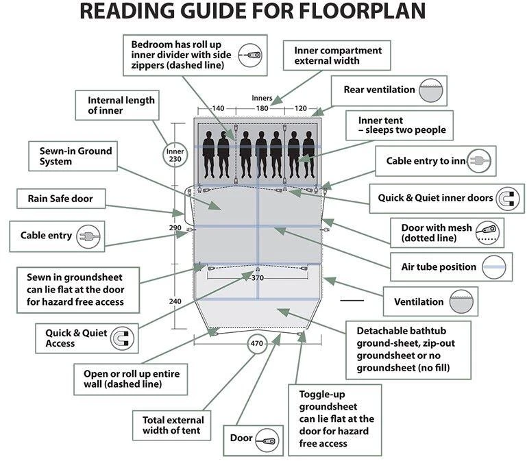 - Abnehmbarer wannenförmiger Zeltboden schützt vor Zugluft ebenso wie vor Krabbeltieren und verhindert, dass Wasser ins Zelt eindringt