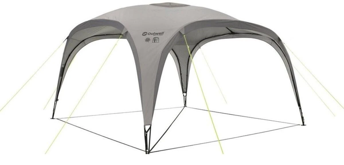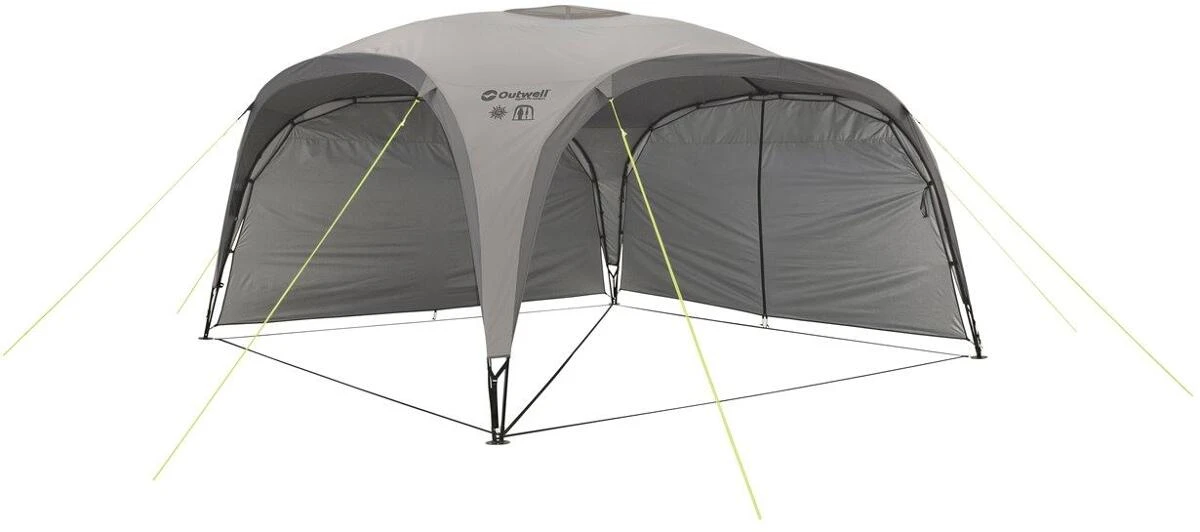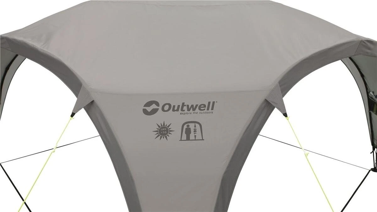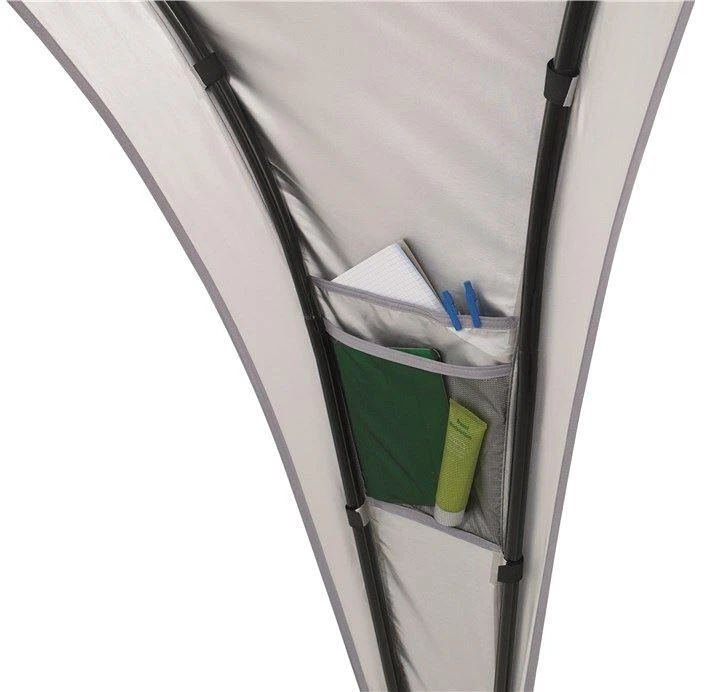 Die Outwell Event Lounge bietet einen vielseitig nutzbaren, frei stehenden Unterschlupf. Die äußerst robuste und stabile Konstruktion zeichnet sich durch große Zugänge und eine bequeme Stehhöhe aus. Dank der Belüftungsöffnung an der Spitze, dem Aufhängepunkt für eine Laterne in der Mitte sowie zwei Netztaschen bietet die Lounge ein Höchstmaß an praktischer Flexibilität. Das Polyester ist mit einer Silber- und PU-Beschichtung versehen, sodass es einer Wassersäule von 1500 mm standhält. Um einen größeren geschützten Aufenthaltsbereich zu schaffen, können miteinander kompatible Schutzdächer über eine Regenrinne verbunden werden.