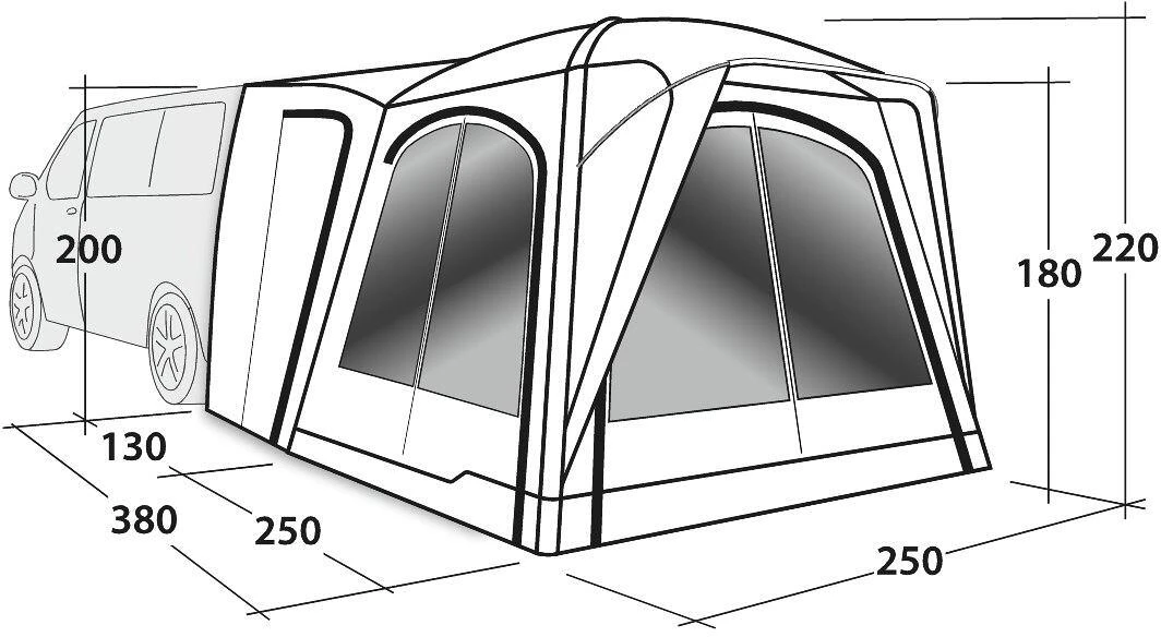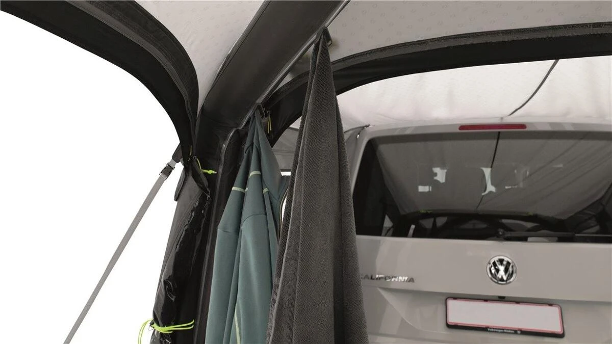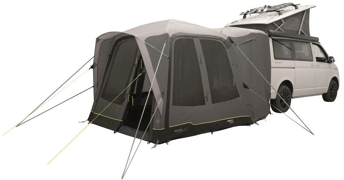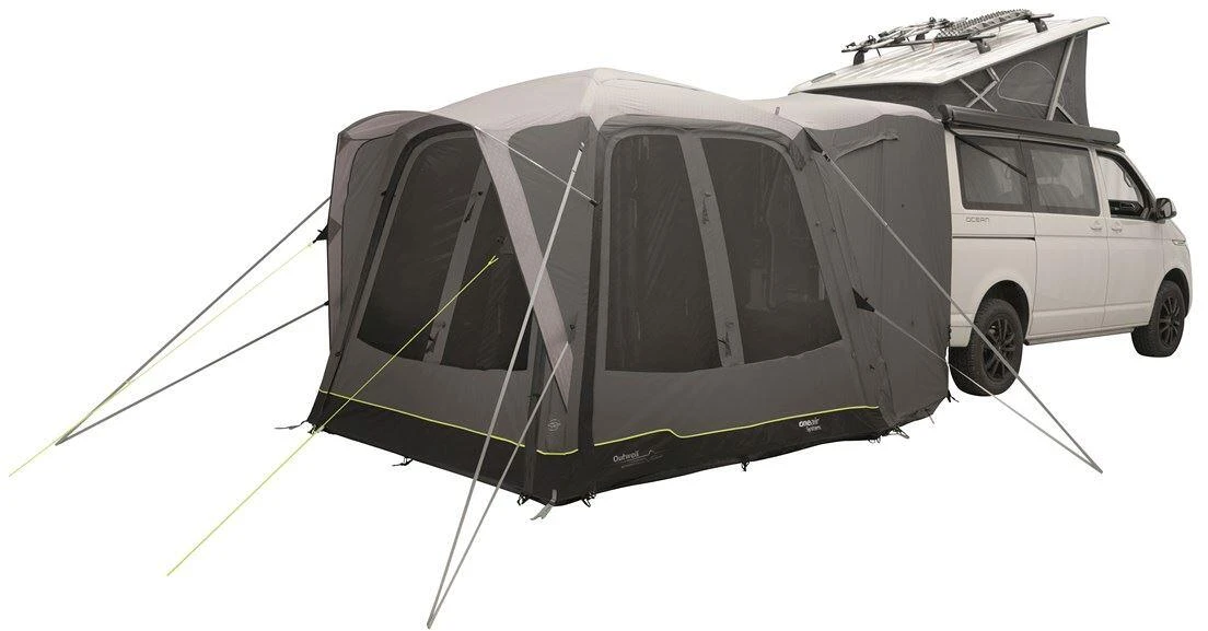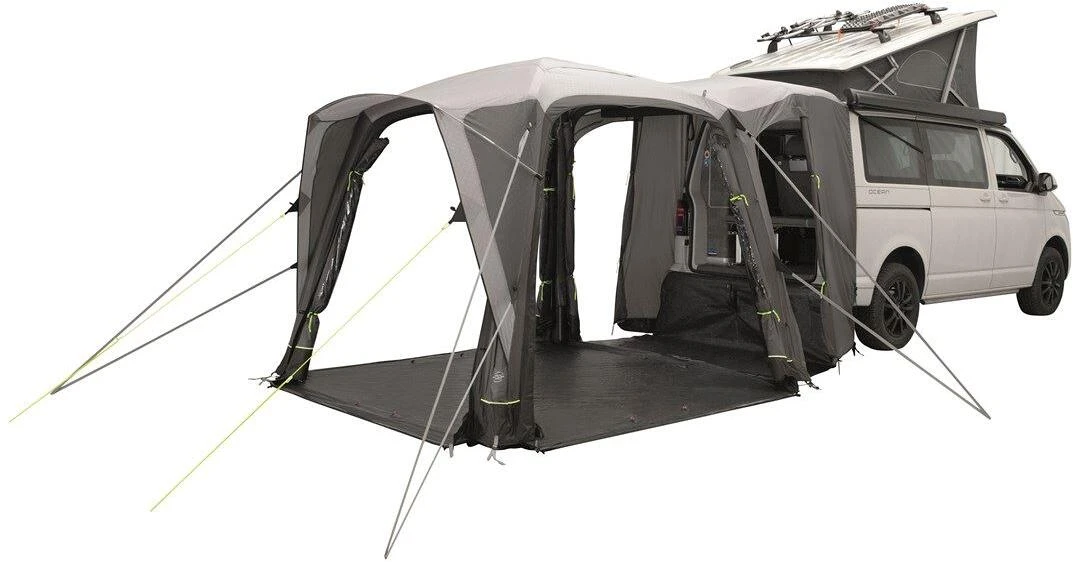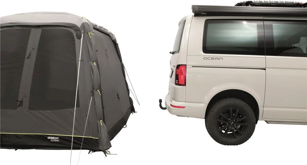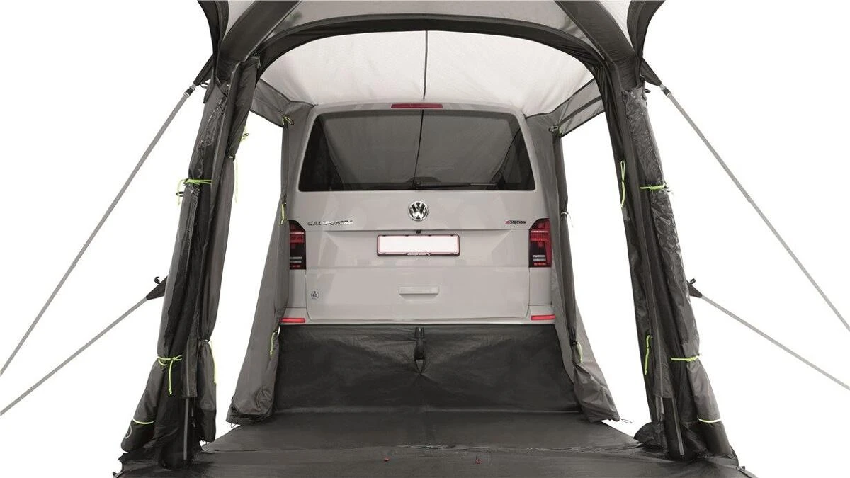 Das einfach aufzubauende Heckzelt Linnburg Air von Outwell bietet zusätzlichen Wohn- und Schlafraum auf dem Campingplatz. Sein vielseitiges Design und den durchgehenden Boden macht es zur idealen Wahl für Freunde, Paare, die mehr Platz suchen, und Familien mit älteren Kindern, die Privatsphäre wünschen. Man wird die Möglichkeit zu schätzen wissen, die Vorder- und Seitenwände vollständig wegzurollen, um einen super luftigen Unterstand zu schaffen, der sich mit der Natur verbindet. Da alle Insektenschutzgitter haben, genießt man die frische Luft, ohne von Insekten genervt zu werden. Die Bus-Heckklappe öffnet komplett im Schleusenbereich, kann aber auch normal wieder verschlossen werden. Für die Schleuse ist eine Bodenplane mit Windschürze im Lieferumfang. Das Zelt ist freistehend und kann auf dem Platz zurückgelassen werden, während man auf Tour geht. Dafür lösen Sie das geniale Befestigungssystem, das keine Seitentüren blockiert, und verschließen die Zeltrückwand, bis Sie wieder am Platz zurück sind.