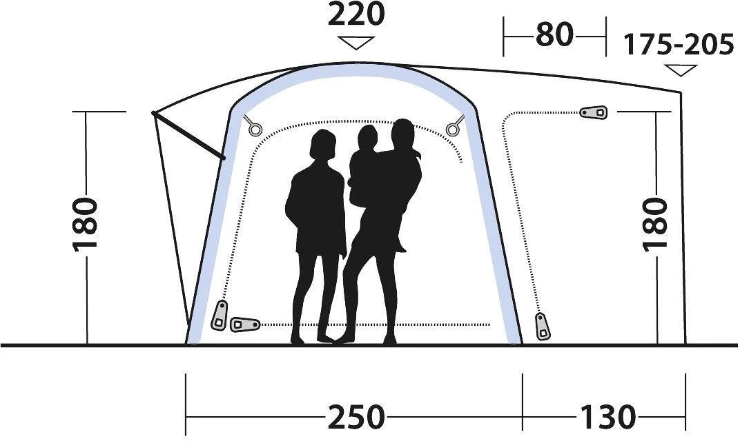 - Die zuverlässigen und benutzerfreundlichen Ventile zum Aufblasen/Ablassen der Luft sind gut zugänglich am Überzelt angebracht