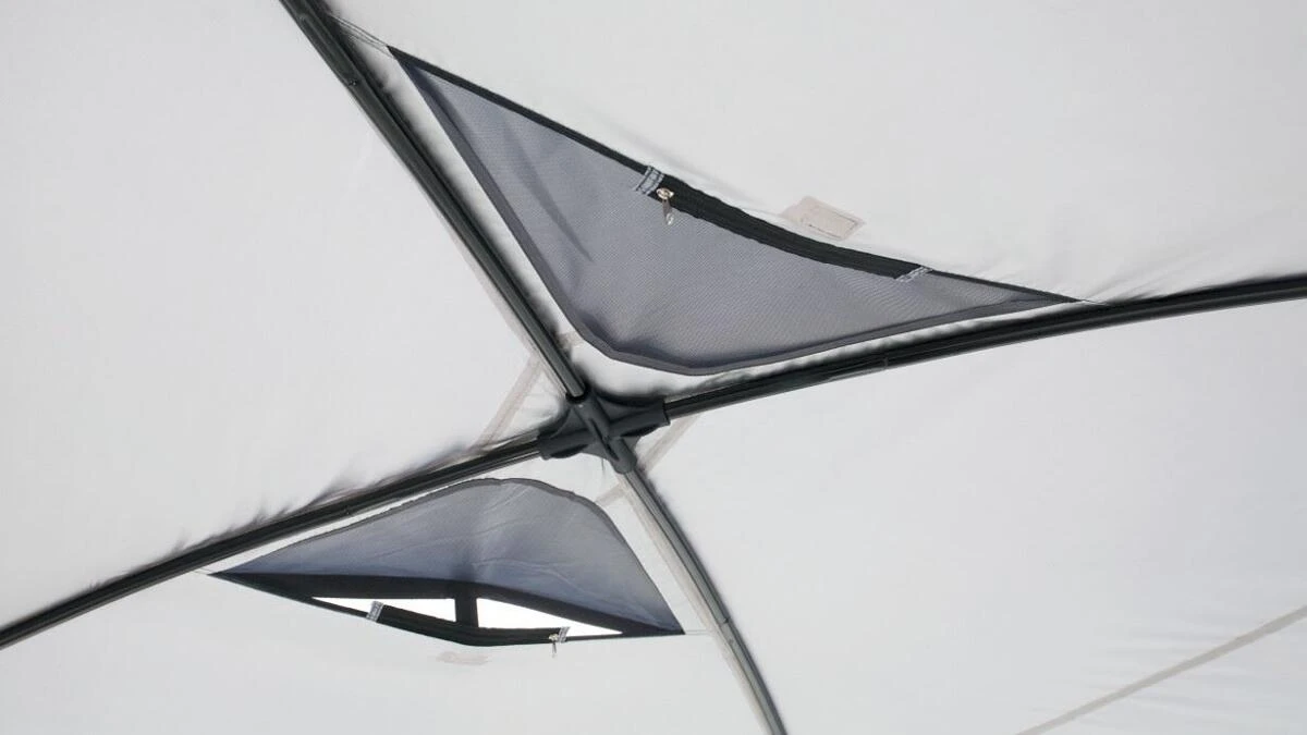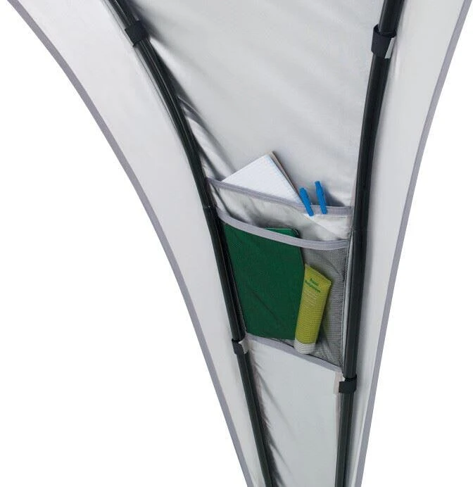 Die Outwell Summer Lounge bietet einen vielseitig nutzbaren, frei stehenden Unterschlupf. Die äußerst robuste und stabile Konstruktion zeichnet sich durch große Zugänge und eine bequeme Stehhöhe aus. Dank der Belüftungsöffnung an der Spitze, dem Aufhängepunkt für eine Laterne in der Mitte sowie zwei Netztaschen bietet die Lounge ein Höchstmaß an praktischer Flexibilität. Der widerstandsfähige Stoff Outtex® 1500 Pro Silver bietet einen UV-Schutzfaktor von über 50. Um einen größeren geschützten Aufenthaltsbereich zu schaffen, können miteinander kompatible Schutzdächer über eine Regenrinne verbunden werden.
