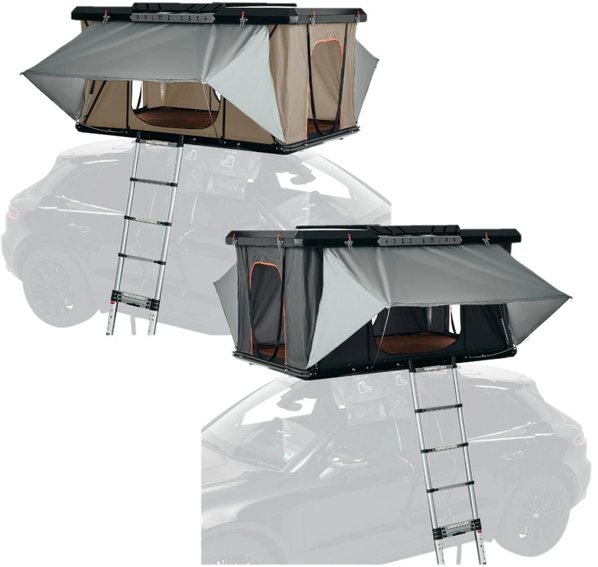 Die Prime Tech Hartschalendachzelte der Serie Gamma vereinen eine kompakte Bauform mit der Robustheit des Voll-Aluminium-Aufbaus und einem geringen Gewicht. Der robuste Eindruck, ohne aufdringlich oder klobig zu wirken, wird durch den Aufbau mit umlaufendem Rahmen und geschlossenem Boden und Oberschale unterstrichen. Sehr stabile Verschlüsse, Scharniere und Leiteraufhängungen runden das Konzept ab. Natürlich sind auch die Befestigungen der Gasdruckfedern ebenso robust gehalten. Innen verfügt das Dachzelt über mehrere Taschen zur Aufnahme persönlicher Ausrüstung, zudem gibt es Schuhtaschen. Alle Fenster bzw. Eingänge sind mit Fliegengase versehen, was eine Lüftung ohne lästige Insekten im Zelt ermöglicht. Die höhenverstellbare Leiter kann wahlweise an einer der beiden Längsseiten als auch am Heck eingehängt werden. Der Zugang ins Zelt ist somit von zwei Seiten möglich. Beide Eingänge sind zusätzlich mit einem Vordach als Sonnen- und Regenschutz versehen. Als besonderes Hightlight, befindet sich auf der Oberschale ein Dachträger zur Aufnahme von bis zu 50 kg Gepäck während der Fahrt.