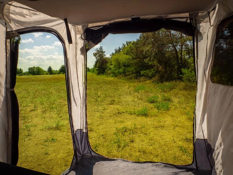 Kein Gestänge, geringes Packmaß, leichtes Gewicht und einfacher Aufbau machen das Update Vito Premium zum perfekten Heckzelt. Die neuen Austattungsmerkmale wie Moskitonetz in allen Ziptüren, Schürze zum Stoßfänger und eingenähte Bodenwanne bieten zusätzlichen Komfort. Die Fronttür hat ein zusätzliches Moskitonetz-Fenster und kann ebenso als Sonnensegel aufgestellt werden. Die beiden Seiteneingänge haben getönte Fenster mit Abbdeckung. Der Bestseller mit Schutz vor Moskitos und Insekten hat eine zusätzliche Lüftung über dem Eingang und kann mit Clips seitlich am Fahrzeug befestigt werden. Die eingenähte Bodenwanne kann mit Klett an der Stoßstange befestigt werden. Das Fenster im Dach ist als Oberlicht weiterhin nutzbar. Der große Innenraum eignet sich für ein Feldbett, Fahrräder, Hundeplatz, Umkleidekabine, Duschzelt etc.. Das Heckzelt wird über die geöffnete Heckklappe gezogen und am Fahrzeug und Boden befestigt.