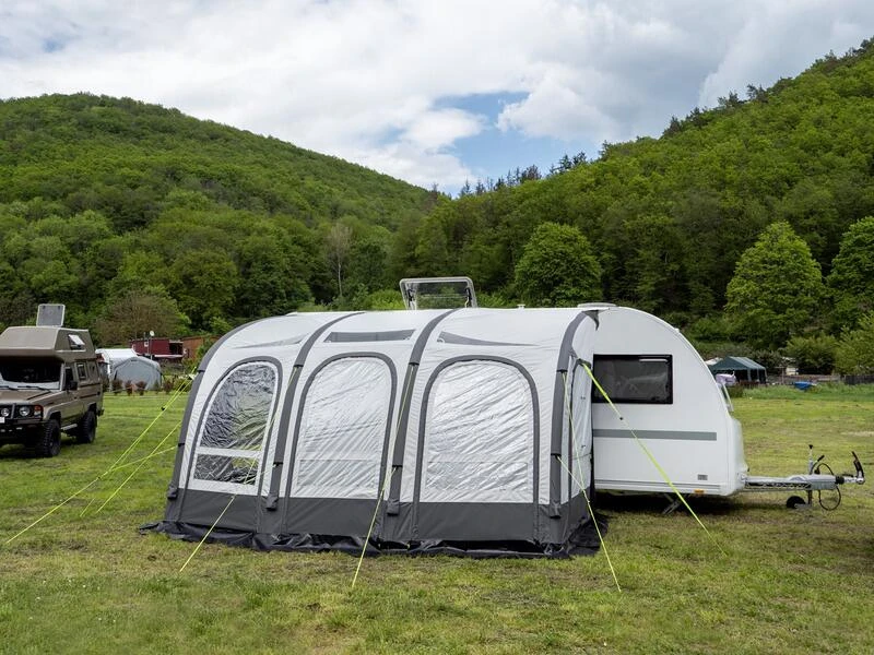 Das Tavira Air 390 Wohnwagenluftvorzelt kann entspannt im Ganzjahreseinsatz genutzt werden. Mit seinem Einpunkt-Aufblassystem erfolgt der Aufbau einfach und schnell. Absolutes Design-Highlight sind die 3 großen transparente Frontfenster mit Innenabdeckungen.