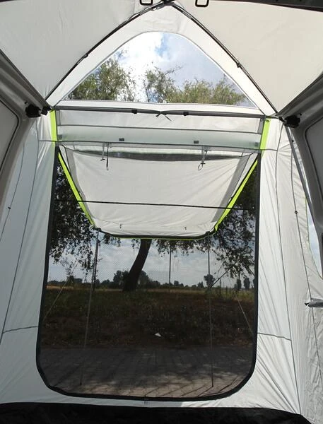 Der Clou beim neu entwickelten Heckzelt UPGRADE DOME PREMIUM: Die Flügeltüren können bei aufgebautem Zelt geschlossen werden. Das Kuppeldach verleiht ein großzügiges Raumgefühl und verhindert gleichzeitig Wassersäcke bei Regen und das U-förmige Stahlrohrgestell verspricht Stabilität. Die Vorderwand besitzt eine große Tür (als Sonnensegel nutzbar) sowie ein transparentes Fenster mit Innenabdeckung und zusätzlich Moskitonetz. Die Seitenwände mit Ovalfenstern sowie das Oberlichtfenster im Dach gewähren eine gute Rundumsicht. Eine Bodenplane mit integriertem Windschutz unter der Stoßstange, die mit Klett fixiert wird, komplettiert das Zelt.