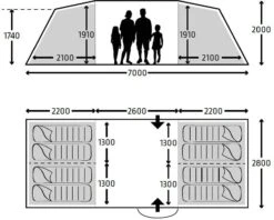- Überzelt: Hydrotex AWT-T, 30D, 335T, Ripstop, silikonbeschichtete Außenseite, innen PU, 100 % Polyester