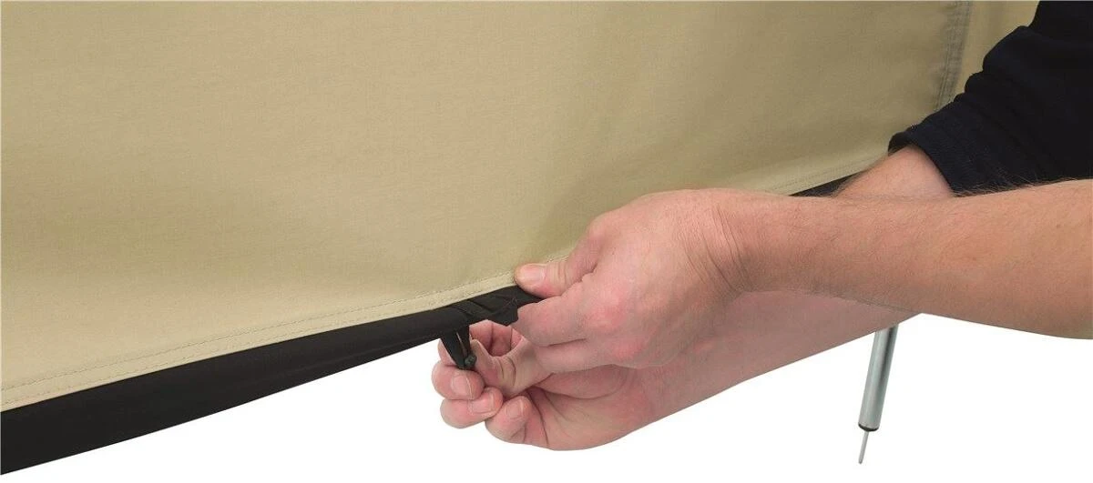 Die 5 m lange Outback-Windschutzplane aus Polycotton bietet Privatsphäre und seitlichen Schutz vor Wind. Sie ist 140 cm hoch und verfügt über einen geteilten Stangenkanal, der es ermöglicht, die Unterseite der Plane aufzurollen, wodurch bei Bedarf eine 27 cm hohe Lücke entsteht, falls ein besserer Luftstrom am Boden gewünscht wird oder man sich den Untergrundbedingungen anpassen muss. Durch Entfernen des unteren 30 cm langen Stangenteils verringert sich die Höhe des Windschutzes, falls die Umgebung dies nötig macht oder man beim Sitzen eine bessere Aussicht möchte.
