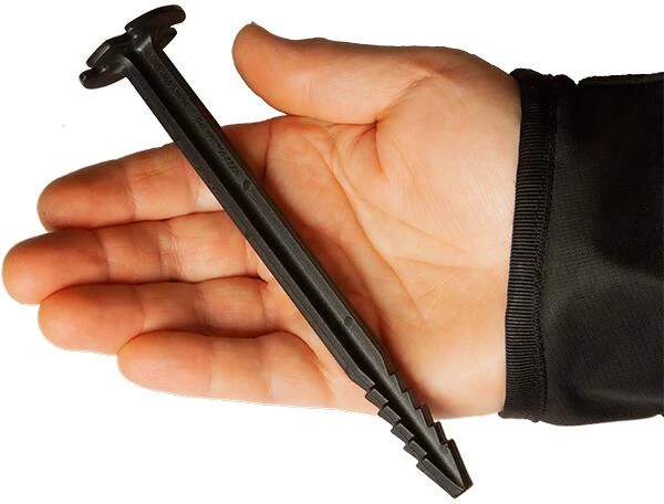 Auch dieser Hering aus recyceltem Kunststoff verzeiht das Einschlagen mit Hammer, Axt oder Stein – es entstehen keine scharfen Kanten, die das Zeltgewebe beschädigen. Da SwissPiranha-Zeltheringe im 90°-Winkel komplett im Boden versenkt werden, sinkt das Verletzungsrisiko gegen Null. Verschmutze Heringe lassen sich in der Spülmaschine reinigen. Ausgediente BlackFisk-Heringe können wiederverwertet werden. Der SwissPiranha BF150 eignet sich für harte, wie auch weiche Böden und kann für alle Zelte, Tarps, Picknickdecken, Abdeckfolien, etc. verwendet werden.