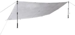 Dieses hochwertige Tarp ist ausgestattet mit verstärkten Ösenpositionen und Gurtbändern für einen flexiblen Aufbau.