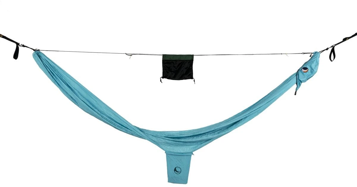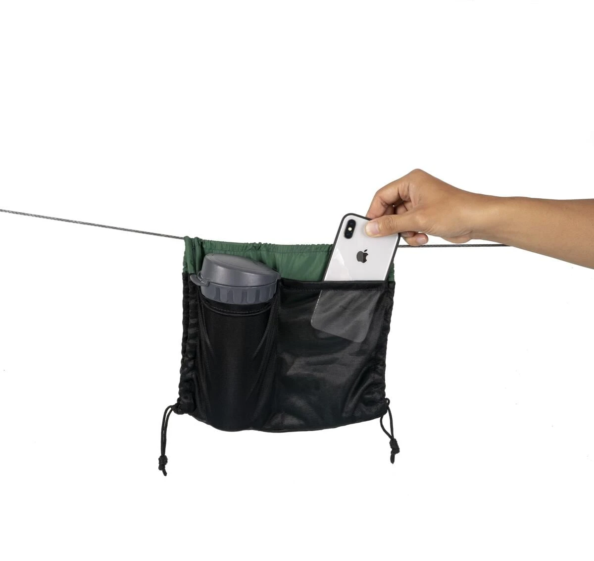 Mit diesem strukturellen und verstellbaren Ridgeline-Set findet man immer und überall in die perfekte Liegeposition. So schläft man deutlich besser und die Installation ist einfach und intuitiv. Eine durchdachte Fusion aus high-end-Materialien und durchdachten Spleißen machen es auch für weniger Knotenaffine Abenteurer:innenn attraktiv. Die Enden werden mit zwei 6kN Karabinern an der Hängematte befestigt. Durch Halten und Ziehen an den markierten Stellen lässt sich die Länge stufenlos bis auf 320 cm verstellen. Dank dem integrierten Organizer Bag sind die wichtigen Dinge immer sicher und in Griffweite, während Schuhe und Wäsche „off the ground“ trocknen. Die Tasche punktet mit insgesamt fünf Fächern, aufgeteilt in ein Hauptfach und vier Seitenfächer. Durch die Schwerkraft und die Integration elastischer Elemente, bleibt alles exakt dort, wo es hingehört. Das Hauptfach kann zugezogen werden und fasst auch mühelos größere Wasserflaschen. Dieses Aufbewahrungssystem bietet ausreichend Platz für die wichtigsten Abenteuer-Accessories, während es kompakt und ohne zu stören über deinem Kokon schwebt. Die Tasche lässt sich nicht nur stufenlos und an die gewünschte Stelle verschieben, sondern bleibt dann auch an Ort und Stelle