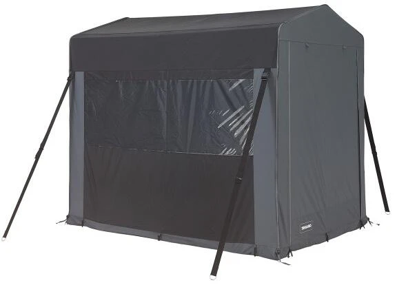 Dieses multifunktionale Lagerzelt ist ideal als Lagerraum oder Sommerküche. Das Zelt besteht aus Spanngurten, PVC-Fenstern mit Rollläden an den Seiten und einem Screen mit Rollläden auf der Rückseite. Der breite Eingang lässt sich leicht zusammenklappen/aufrollen. Die Höhe des Lagerzeltes beträgt am tiefsten Punkt 180cm und am First 205cm. Lieferung mit Tragetasche.