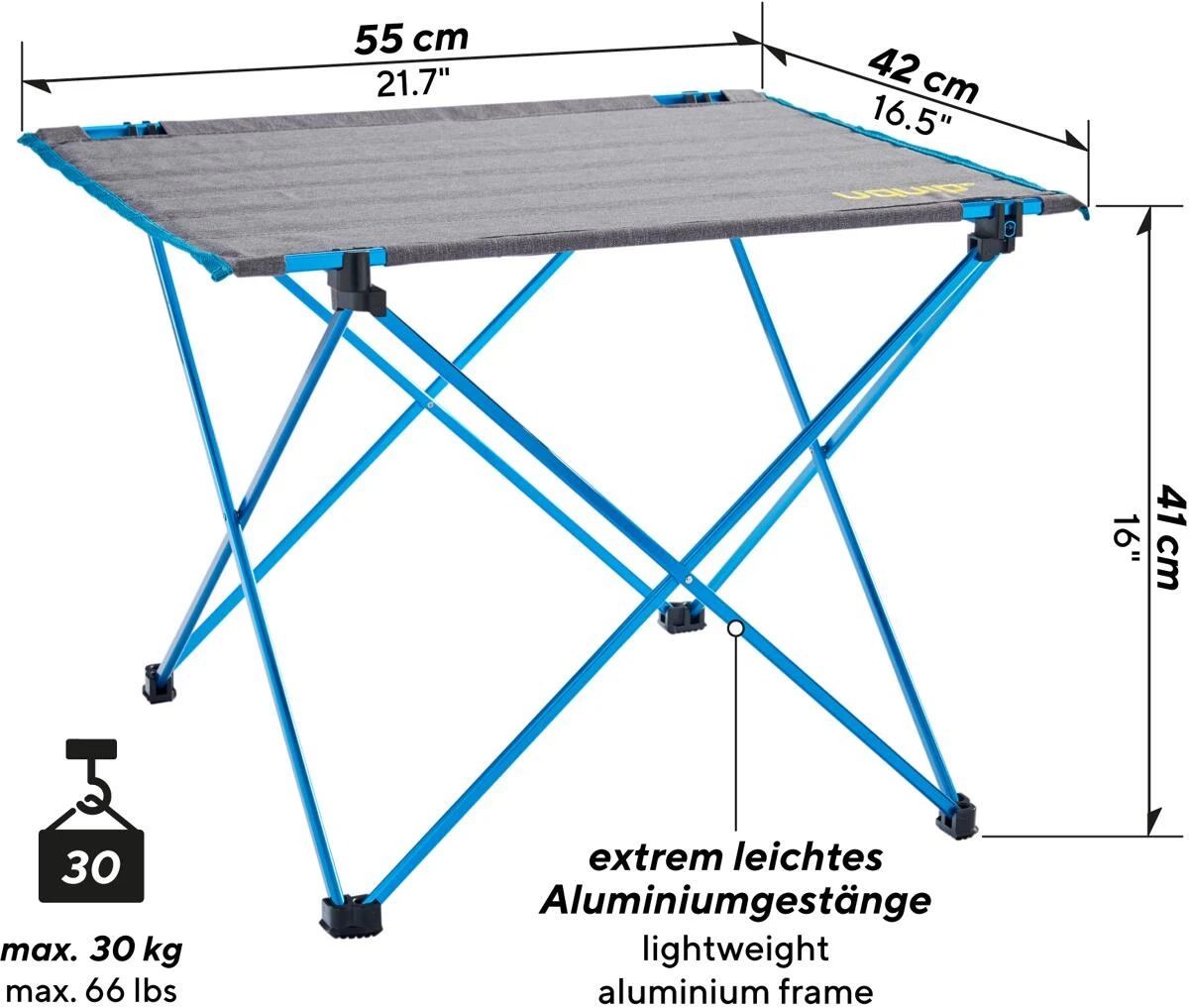 Leichtgewichtstisch mir verstärkter Tischplatte, damit nichts umkippt. Sehr schnell aufzubauen und ultra-leicht.