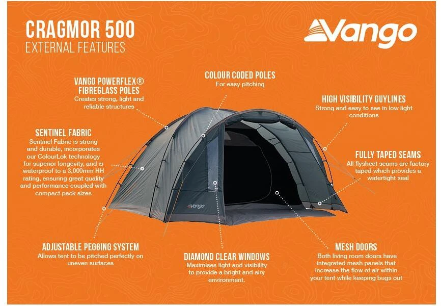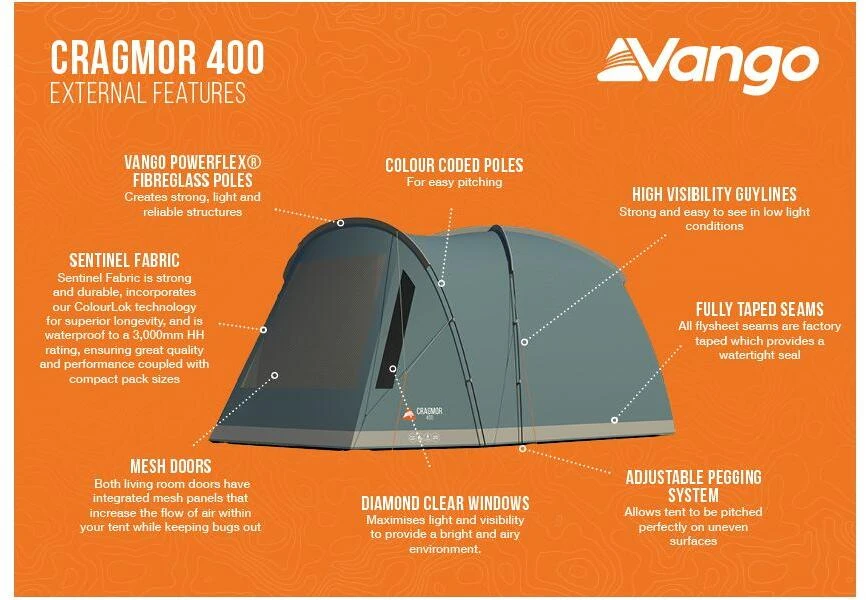 Das Vango Cragmor ist ein Kuppelzelt mit drei Zeltstangen. Es verfügt über einen großen Vorraum, der sich perfekt für die Aufbewahrung von Ausrüstung oder als Schutz vor den Elementen eignet. Damit ist das Vango Cragmor das perfekte Zelt für kleine Familien und Paare. Große Mesh Öffnungen an der Innenseite halten die Zelte bei warmen Bedingungen kühler und reduziert die Kondensation. Das absolute Highlight bietet das große Diamant klare PVC-Fenster für maximale Licht und große Sichtbarkeit.