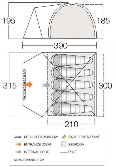 - Mesh-Tür – die Wohnzimmertür hat ein integriertes Mesh-Paneel, dass die Luftzirkulation im Zelt erhöht und gleichzeitig Ungeziefer fernhält