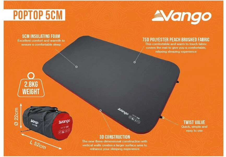Speziell für Wohnmobile entwickelt, bietet die selbstaufblasende PopTop-Schlafmatratze ultimativen Komfort für Wohnmobilisten. Sie besteht aus weichem, gebürstetem 75-Denier-Gewebe mit 3D-Konstruktion, um sicherzustellen, dass die gesamte Oberfläche genutzt werden kann, damit man überall bequem schlafen kann. Sie verfügt über ein Drehventil zum einfachen Aufblasen und problemlosen Ablassen der Luft.