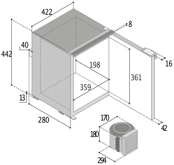 Die Vitrifrigo Kühlschränke mit abnehmbarer, externer Kühleinheit. Da die Kompressoreinheit nicht im Kühlschrankgehäuse integriert ist, ergibt sich zusätzliches Stauvolumen im Inneren des Kühlschranks. Darüber hinaus werden die Einbaumöglichkeiten im Fahrzeug erweitert, da die Kompressoreinheit ca. 150 cm entfernt vom Kühlschrank verbaut werden kann. Das bietet höchste Flexibiliät im Einbau.