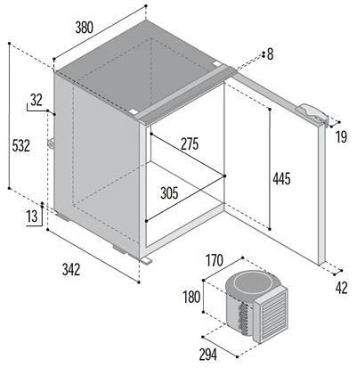 Vitrifrigo C42LX Modell ist ausgestattet mit einer separaten, versetzbaren Kompressoreinheit, die getrennt vom Kühlschrank verbaut werden kann. Das sorgt für eine hohe Flexibilität beim Einbau in das Fahrzeug.