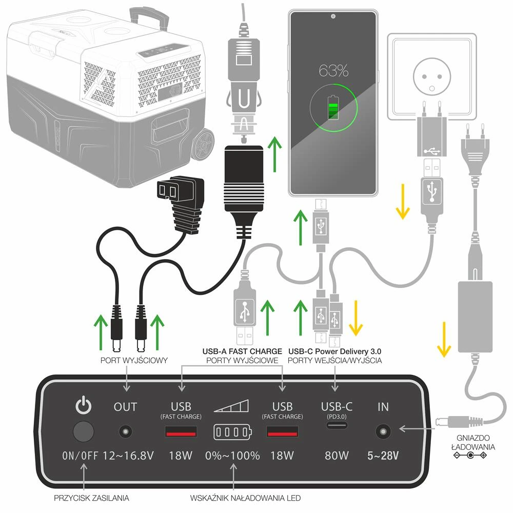 Das Gerät kann als Stromquelle für tragbare Kühlschränke, Geräte, die über den 12-V-Zigarettenanzünder betrieben werden, und andere Geräte, die über USB-A/USB-C-Ports betrieben werden, verwendet werden. USB-A-Schnelllade-Ausgangsports unterstützen das schnelle Laden von bis zu zwei Geräten gleichzeitig – max. 2 x 18 W. USB-C (PD3.0) Ausgangs-/Eingangsport unterstützt das Ladeprotokoll Power Delivery 3.0 – max. 80 W. Das Gerät verfügt über einen Schutz gegen Überhitzung, Überladung und Tiefentladung des Akkus.