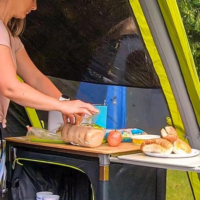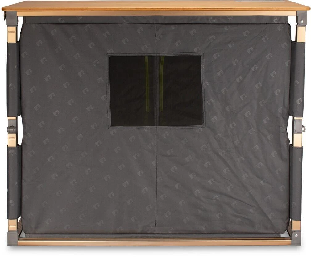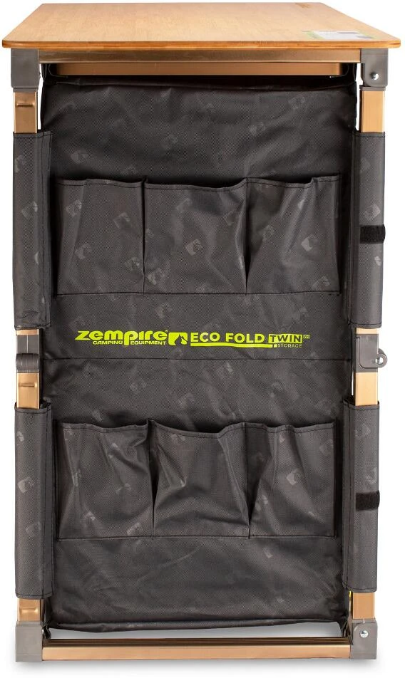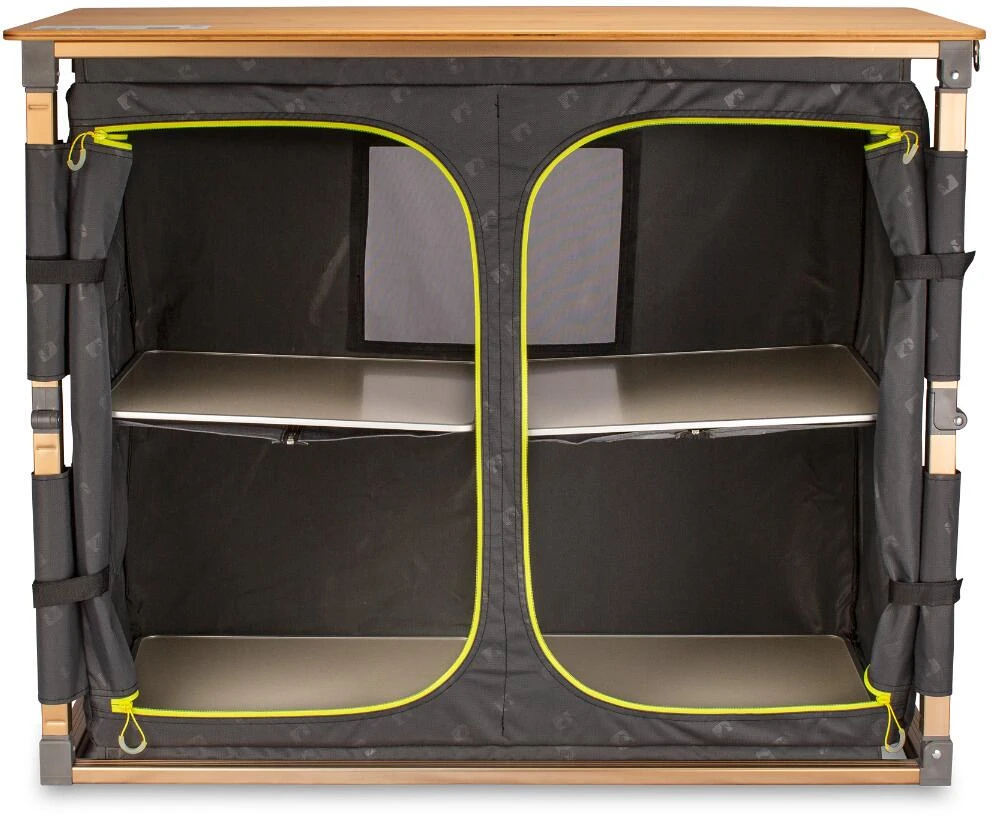 Der Eco Fold Twin V2 von Zempire in seinem ansprechendem Design mit Bambus-Tischplatte eignet sich hervorragend als Organizer in Wohn, Schlaf, oder Küchenbereich. Verfügt über eine Arbeitsfläche zum kochen und zubereiten von Camp-Mahlzeiten aus natürlichem wetterfestem und hitzebeständigen Bambus und einen rostfreien Aluminiumrahmen. Die beiden unteren Schränke mit Reißverschluss und die seitlichen Aufbewahrungstaschen tragen dazu bei, dass alles organisiert bleibt. Ein ausziehbares Ablagefach hält Utensilien griffbereit und kann auch ein Waschbecken zum Abwaschen aufnehmen.